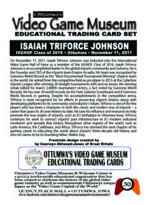 On November 11, 2017, Isaiah TriForce Johnson was inducted into the International Video Game Hall of Fame as a member of the IVGHOF Class of 2016.